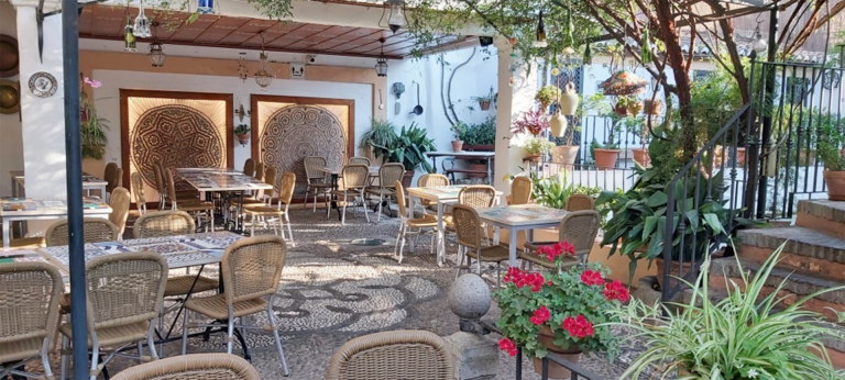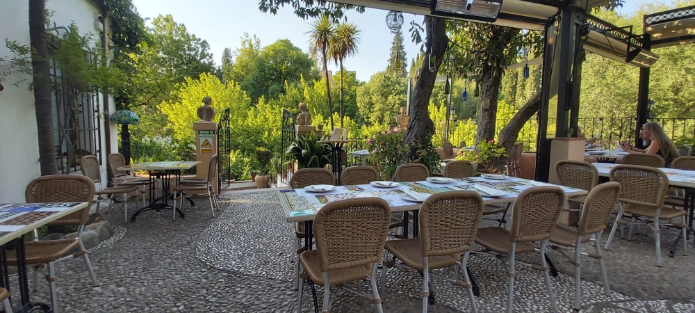 Las tres terrazas ajardinadas y rodeadas de árboles y flores, son el lugar perfecto para disfrutar de una comida al aire libre con vistas sobre la muralla de la Alhambra.